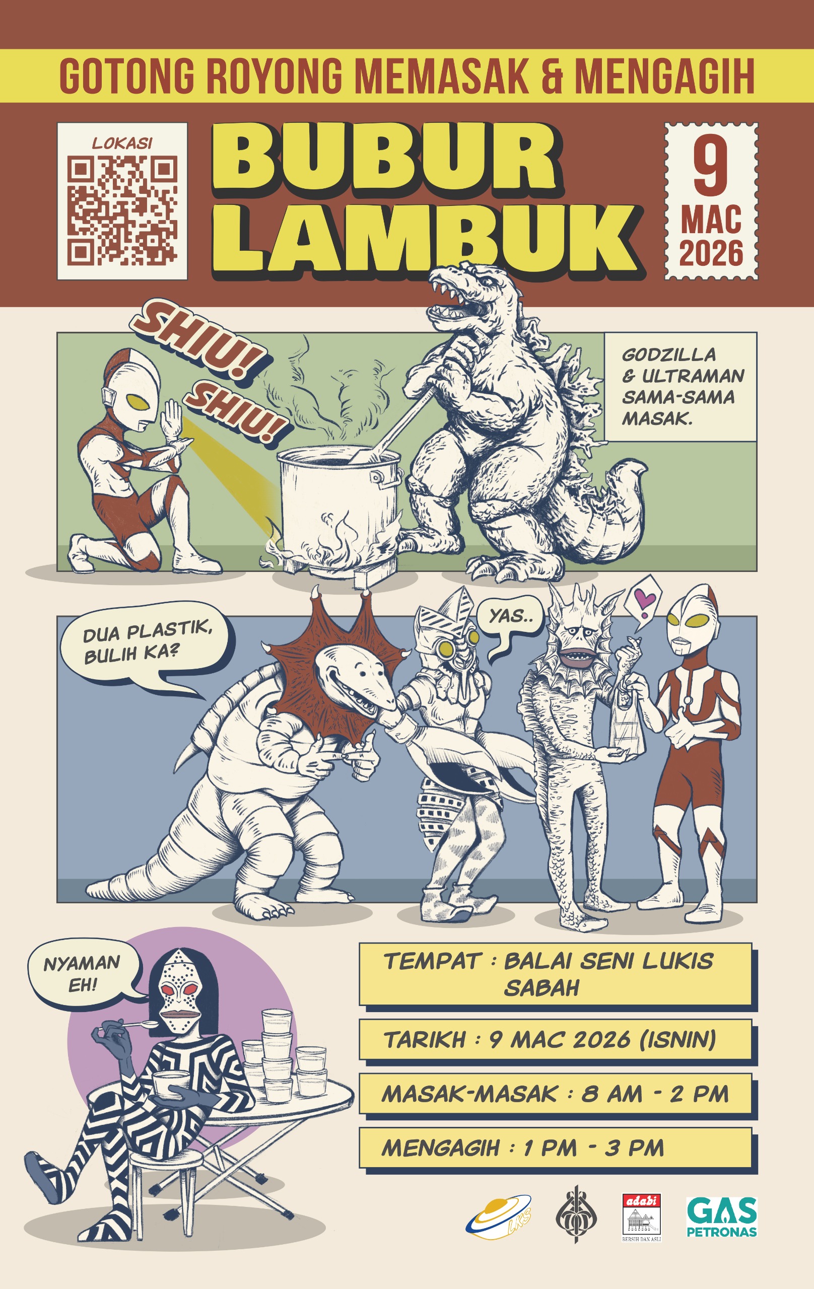 Sempena bulan Ramadan, Balai Seni Lukis Sabah menjemput agensi-agensi kerajaan, pengiat seni serta komuniti setempat bersama-sama dalam aktiviti Gotong Royong Memasak & Mengagih Bubur Lambuk dengan kerjasama Adabi dan Petronas.